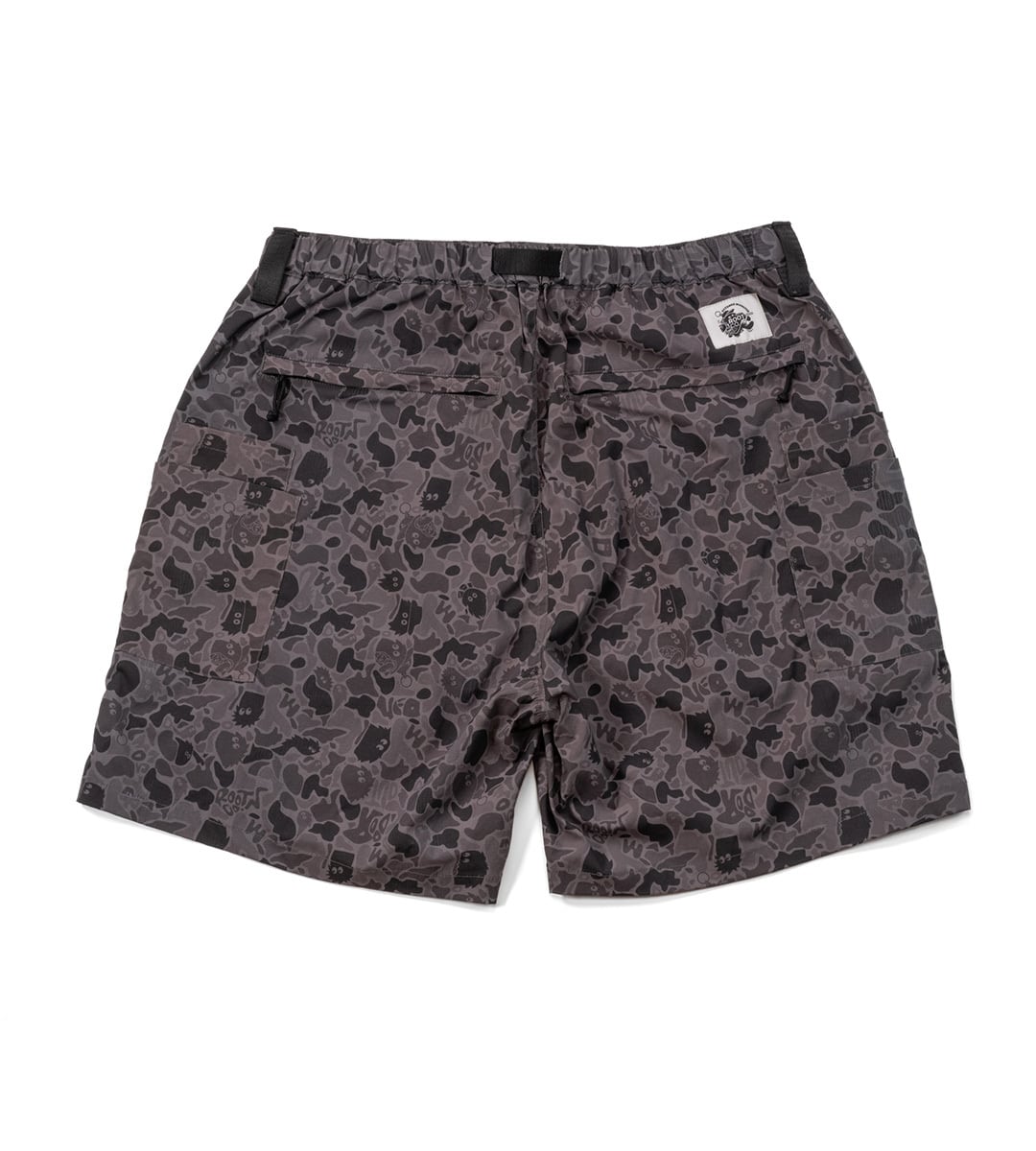 PLAY STRETCH UTILITY Shortsのアウトドアモンスターカモフラver.。フロントにベルクロネーム、バックにコネクトボーイをあしらった織りネームを配置しました。